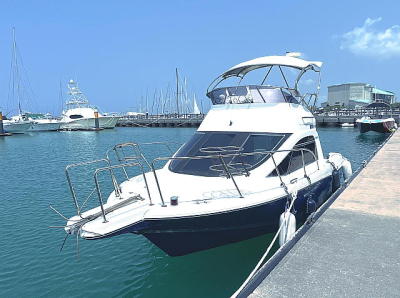 フライングブリッジでありながら25フィートという小型クルーザーなので扱いが簡単で、さらに船外機が2機なので小回りも効きますから、ステップアップの練習にはちょうどよいかと思います。
